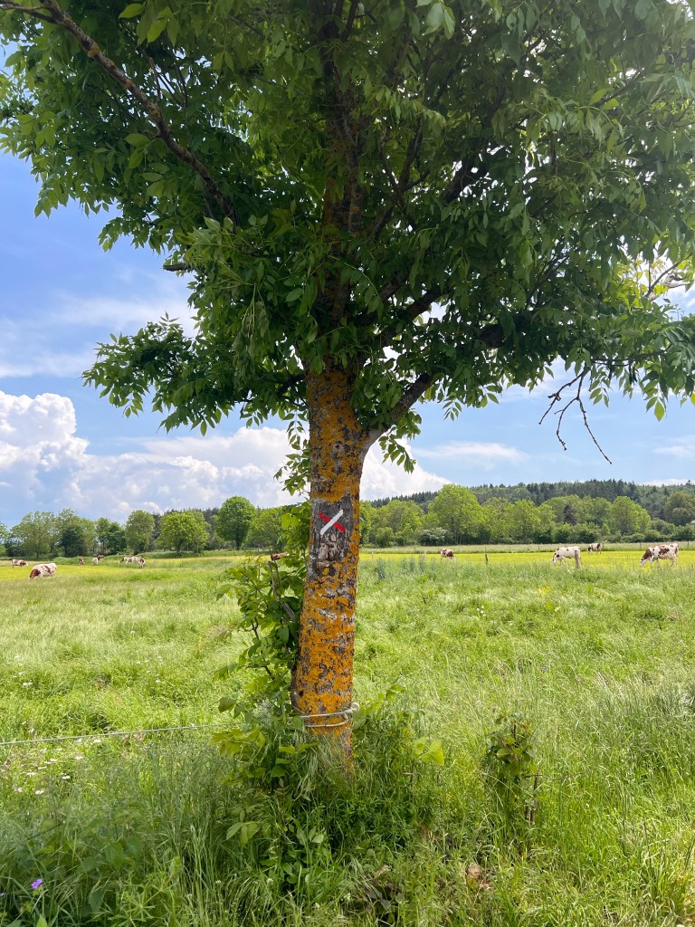 Luckily the walk wasn’t nearly as strenuous as yesterday, but my body was really tired. It started to hurt. My backpack felt heavy. I adjusted it a hundred times. Somehow after my first rest stop and eating a delicious Pain au Raisin that I picked up before leaving Sauges I felt a lot better. My backpack was in a good spot and it felt better. I found my stride and I picked up my pace. The landscape also starting to change from big mountains to rolling green expanses. The scenery is a great distraction.