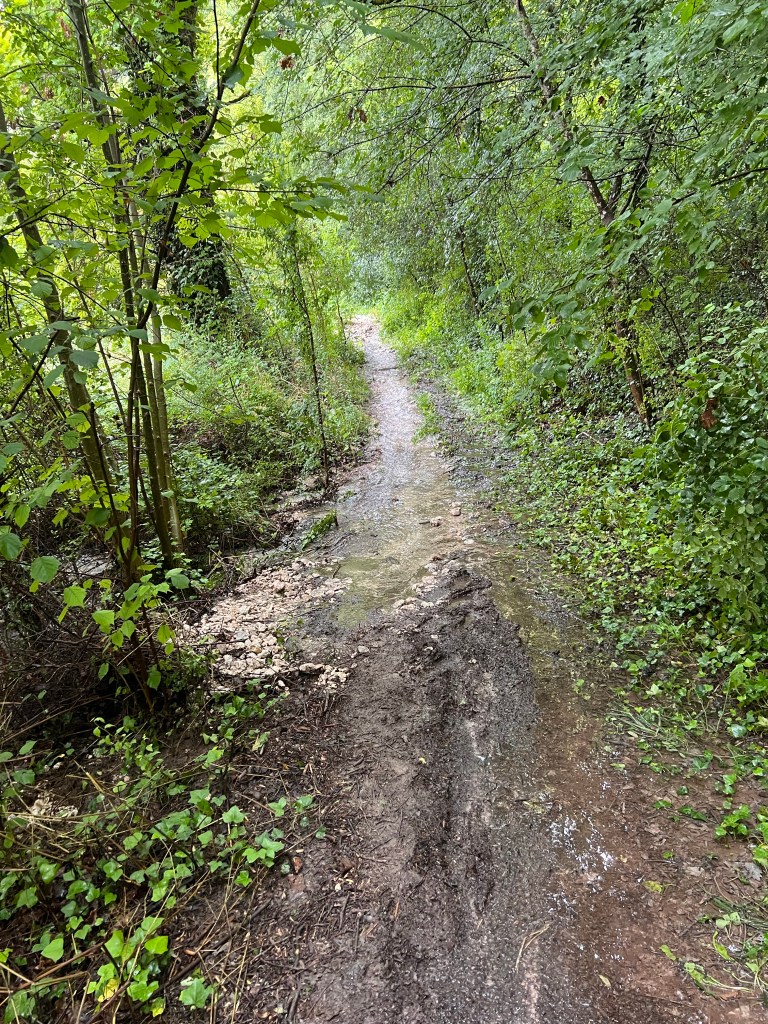The puddles cross the trail so I have to navigate my way around them. The edges are more stable. At one point today the path had turned into a waterfall and I had to go through slowly. Very slippery.